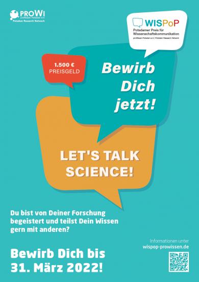 Let’s talk science! Wissenschaftskommunikation populär: Science Blogs, Videos, Ausstellungen, Schülerlabore, Vorträge, Citizen Science Projekte – viele Potsdamer Wissenschaftlerinnen und Wissenschaftler lassen in innovativen Formaten die Öffentlichkeit an ihrer Forschung teilhaben. Der Verein proWissen Potsdam unterstützt gemeinsam mit der Stiftung pearls - Potsdam Research Network dieses Engagement und schreibt auch 2022 den WISPoP – Potsdamer Preis für Wissenschaftskommunikation in Höhe von 1.500 Euro für Nachwuchswissenschaftlerinnen und Nachwuchswissenschaftler aus. Darüber hinaus wird dieses Jahr einmalig der mit 500 Euro dotierte WISPoP - Publikumspreis vergeben.