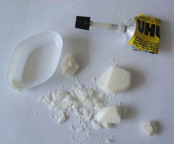 • Klebe ein Stück Seife mit dem Flüssigkleber an eine kurze Kante der Streichholzschachtel