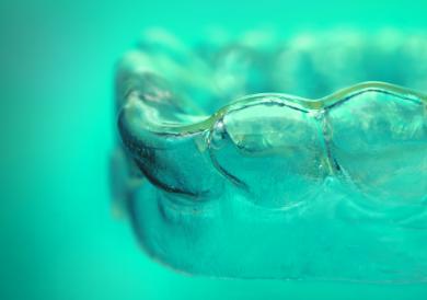 Foto: Mit Alignern aus Formgedächtnispolymeren kann die Anzahl kieferorthopädischer Zahnschienen im Verlauf einer Therapie reduziert werden. © Fraunhofer IAP
