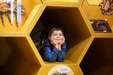 In der Mitmach-Ausstellung lernen Kinder und Erwachsene das faszinierende Leben eines Bienenvolks kennen. Mit allen Sinnen tauchen sie in den Alltag der fleißigen Tierchen ein. Sie erfahren von deren verblüffenden Fähigkeiten und staunen darüber, wie Bienen sich untereinander verständigen und welche sozialen Rollen sie einnehmen. Nicht zuletzt zeigt die Ausstellung auch, welche Gefahren der Honigbiene und ihren Verwandten – den Wildbienen – begegnen: von bärigen Honigdieben bis zur intensiven Landwirtschaft.