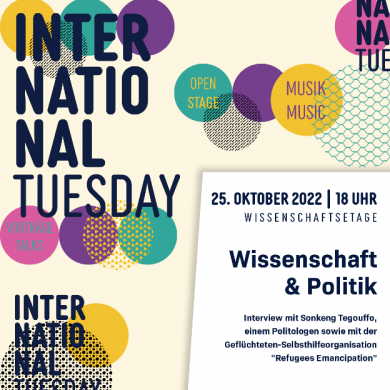 Am kommenden Dienstag, den 25.10.2022, laden wir herzlich 18 Uhr zum International Tuesday in die Wissenschaftetage im Bildungsforum Potsdam ein. Bei dieser Veranstaltung richten wir unseren Fokus auf das Thema Geflüchtete und ihre Geschichten. Es geht um Emanzipation und Integration. Die Wörter Asyl und Migration sind allgegenwärtig: Geschichten, Ursachen und Zusammenhänge eher nicht. Der Politologe Sonkeng Tegouffo wird nach einem einleitenden Podcast mit uns ins Gespräch kommen - dabei sprechen wir darüber, ob Potsdam ein sicherer Hafen für alle ist.
