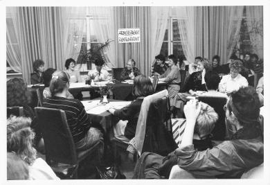 Foto: Erste öffentliche Vorstellung der Unabhängigen Initiative Potsdamer Frauen im Klub der Künstler und Architekten „Eduard Claudius“, 28. Januar 1990 © Jeanette Toussaint, Foto Bernd Gurlt