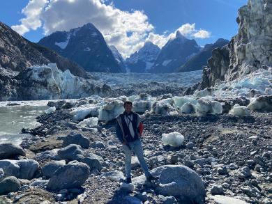 Foto 1: Dr. Georg Veh vor dem Lake No Lake, einem See in British Columbia (Kanada), der durch den Tulsequah Gletscher im Hintergrund aufgestaut wird und sich mehrmals jährlich entleert. (Foto: Natalie Lützow)