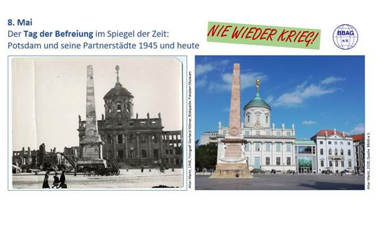 Anlässlich des 75. Jahrestages dieses historischen Ereignisses und um die Erinnerung an die Schrecken des Zweiten Weltkrieges und die Konsequenzen eines totalitären Systems aufrecht zu erhalten, hat die Berlin-Brandenburgische Auslandsgesellschaft e.V. (BBAG) zusammen mit den Potsdamer Partnerstädten eine virtuelle Fotoausstellung erstellt, die die Situation in den jeweiligen Städten um 1945 und heute darstellen.