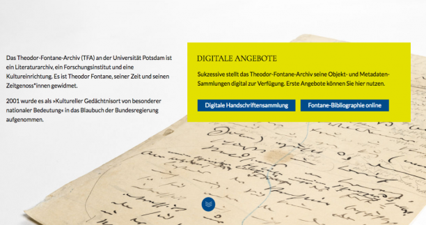 Daneben steht das umfangreiche online-Angebot des Archivs zur Verfügung. So haben Besucher*innen der Website etwa kostenfreien Zugang zu den ersten 50 Jahrgängen der seit 1965 vom Archiv herausgegebenen Zeitschrift Fontane Blätter und zu großen Teilen der digitalisierten Handschriftenbestände des Archivs.