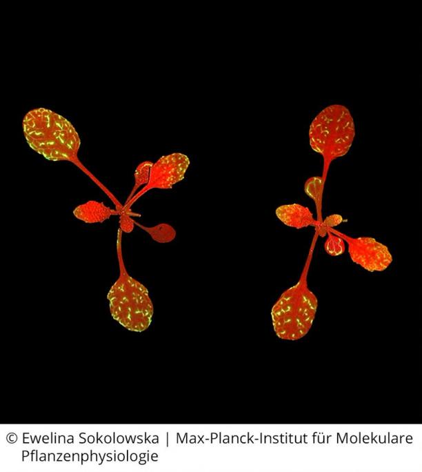 Makroskopische Aufnahmen von zwei Arabidopsis thaliana-Pflanzen, die mit einem gelb/grün fluoreszierenden Farbstoff beladen sind, der über das Phloem zu entfernten Blättern transportiert wird.