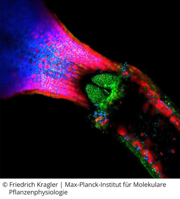 Grün fluoreszierende Markerproteine machen das Sprossmeristem (Pflanzenstammzellen) zwischen roter Anthocyanin- und blauer Chloroplasten-Autofluoreszenz sichtbar.