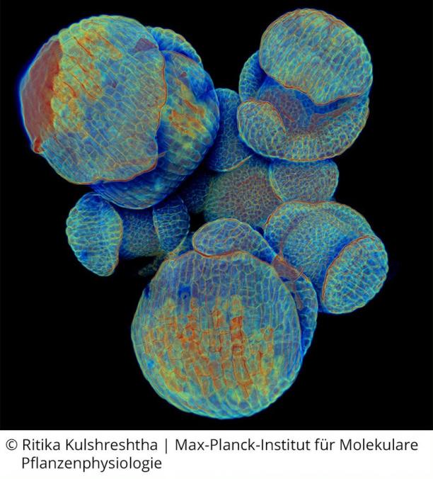 Konfokalaufnahme einer sich aus Meristemgewebe der Sproßspitze entwickelnden Blüte bei Arabidopsis thaliana.