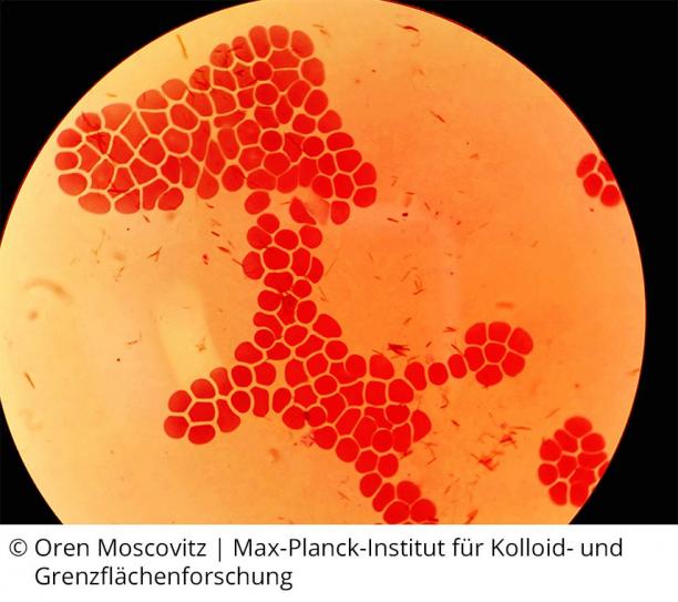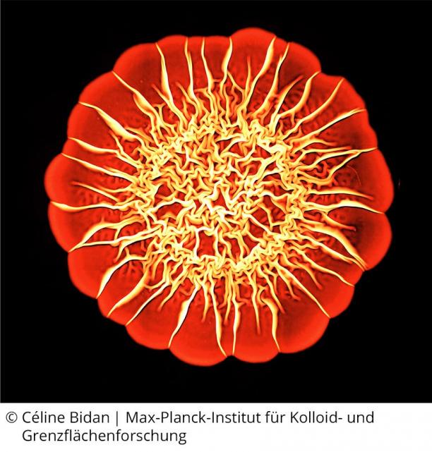 E.coli Bakterien, auf nahrhaften Agar-Gelen gezüchtet, bilden Biofilme mit faszinierenden, faltenbildenden Mustern.