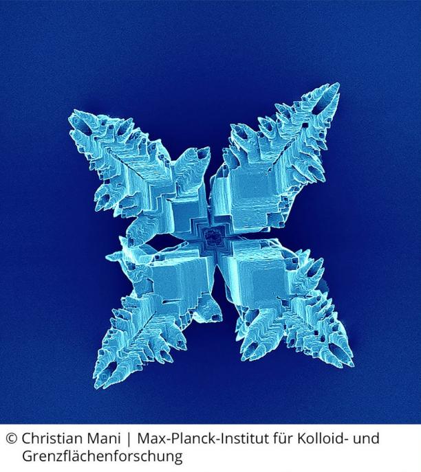 Poröse Kohlenstoffmaterialien werden heute in Technik und Forschung in verschiedensten Bereichen eingesetzt, zum Beispiel in der Gasspeicherung, in der heterogenen Katalyse oder in der Elektrochemie. Mit ihrer extrem vergrößerten Oberfläche, ihrer guten Leitfähigkeit sowie einer hohen thermischen und chemischen Beständigkeit eignen sie sich unter anderem besonders gut als Elektrodenmaterial für sogenannte Superkondensatoren. Um poröse Kohlenstoffmaterialien möglichst unkompliziert herzustellen, können poröse kristalline Materialien, sogenannte Koordinationspolymere, als Ausgangsverbindung genutzt werden. Ein solcher kristalliner Metallkomplex ist hier zu sehen. Er besteht aus Quadratsäure, welche in charakteristischer Weise um Zink-Ionen herum angeordnet ist und besitzt eine einzigartige Morphologie, die sehr stark einer Schneeflocke ähnelt.