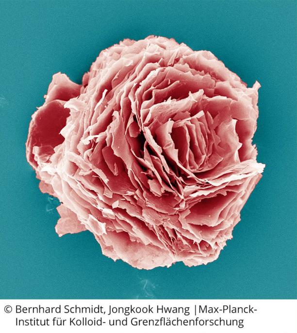 Hierarchische Selbstanordnung von metall-organischen Nanoschicht-Blütenblättern zu einer mesokristallinen Mikrorose.