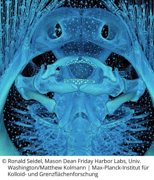Das Bild (Mikro-Computertomographie) zeigt den Kopf und kräftigen Kauapparat eines Süßwasserrochens aus dem Amazonasbecken.