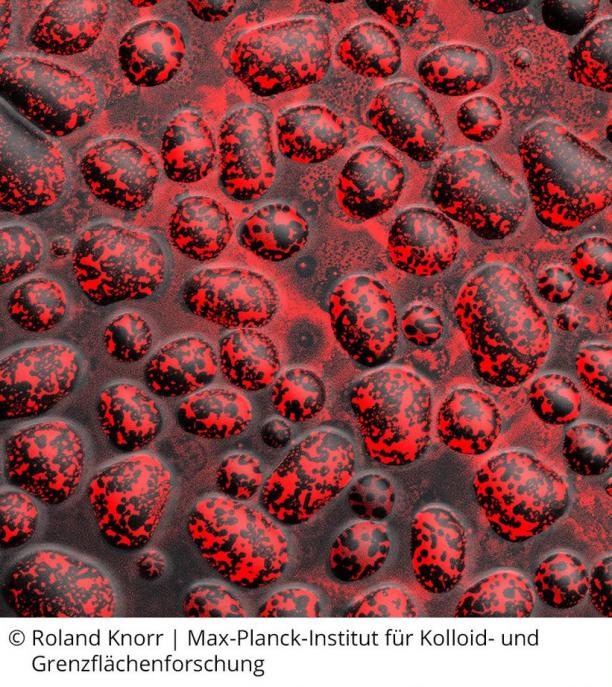 Die einzelnen, mikroskopisch kleinen Wassertropfen sind mit einer Schicht Lecithine überzogen, die sich im Zustand einer Phasenentmischung befinden.