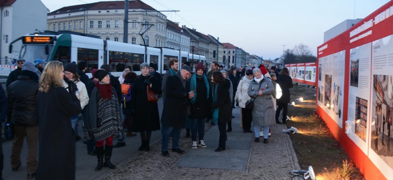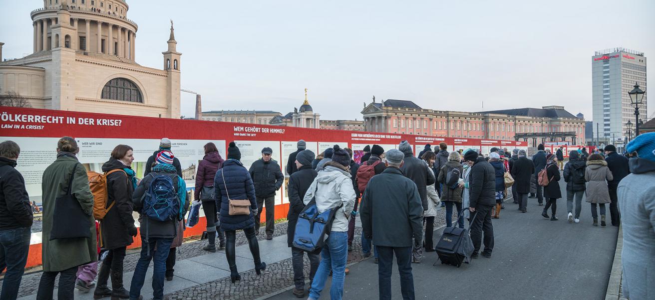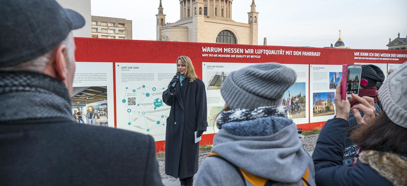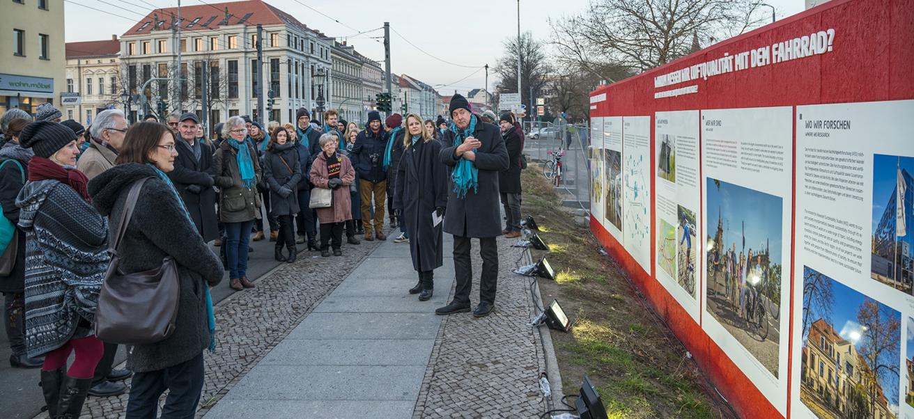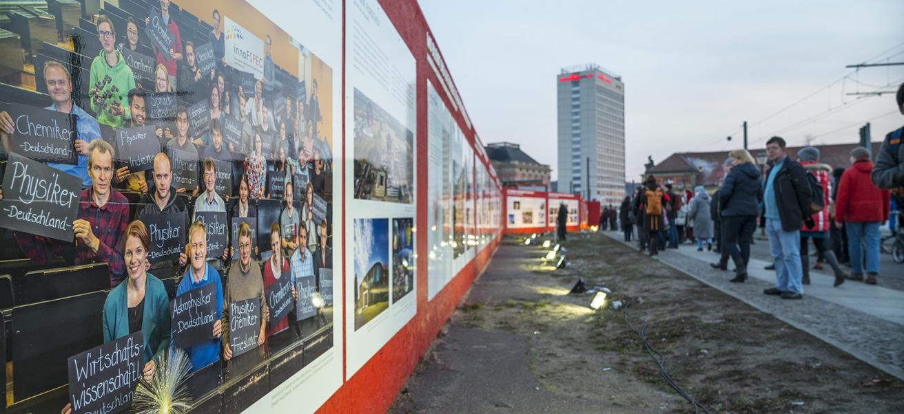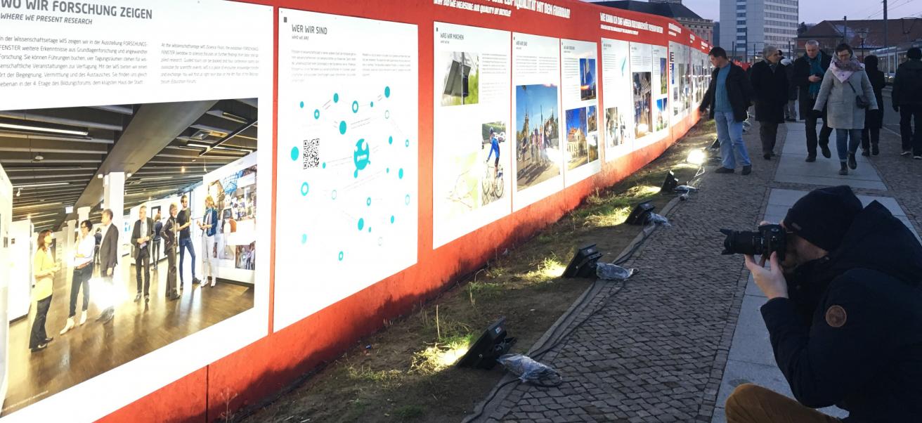 Die Wissenschaft geht auf die Straße: Auf 130 Metern präsentierte die Open-Air-Ausstellung WISSENSCHAFT IM ZENTRUM am Bauzaun entlang der Baustelle zwischen Bildungsforum und Landtag ausgewählte Forschungsprojekte der Region. Universitäten und Hochschulen, außeruniversitäre Institute, Museen und eine Gedenkstätte zeigen, an welchen Themen und Forschungsfragen sie arbeiten: Insgesamt wurden 20 Forschungsprojekte präsentiert, die die Vielfalt der Themen, Netzwerke und Methoden veranschaulichen. So ging es unter anderem um das Klima, die Sicherheit in der Stadt, ob unser Völkerrecht in der Krise ist, warum wir essen was wir essen und ob man in einem Wissenschaftspark spazieren gehen kann.